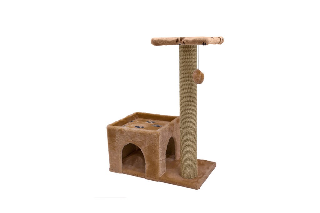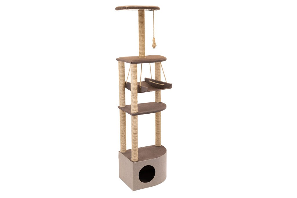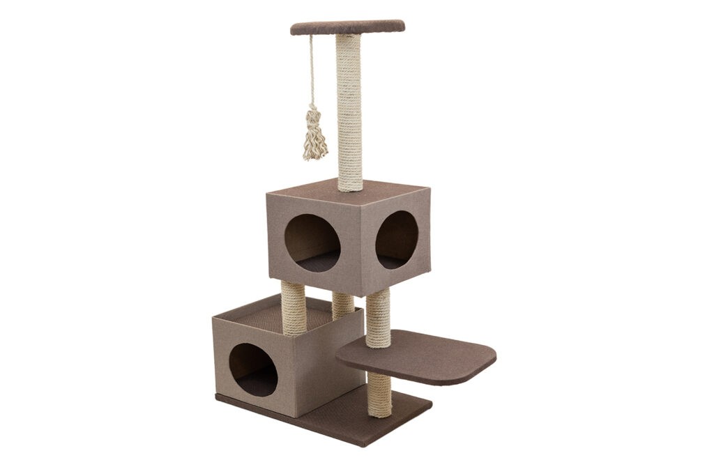 Darell scratching post complex, “High-Tech” series, level 4. with 2 houses and a regiment. 35*83*h117cm (matting, bleached jute) The complex is made of chipboard. It has scratching post pipes wrapped with jute rope. Easily