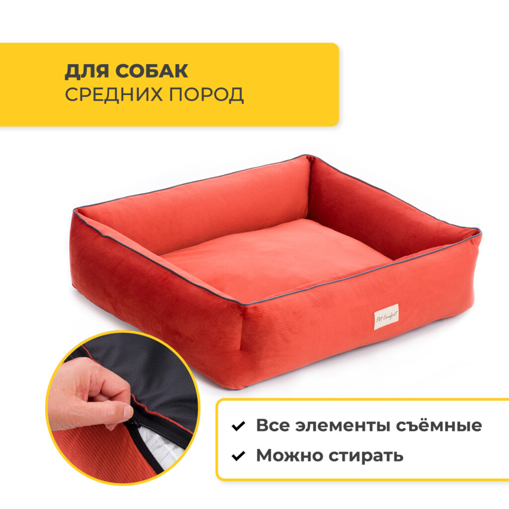 Удобная лежанка с бортиками для собак средних пород. Высокие бортики создают ощущение дополнительного комфорта. Легкоочищаемый материал лежанки. Съёмный чехол можно