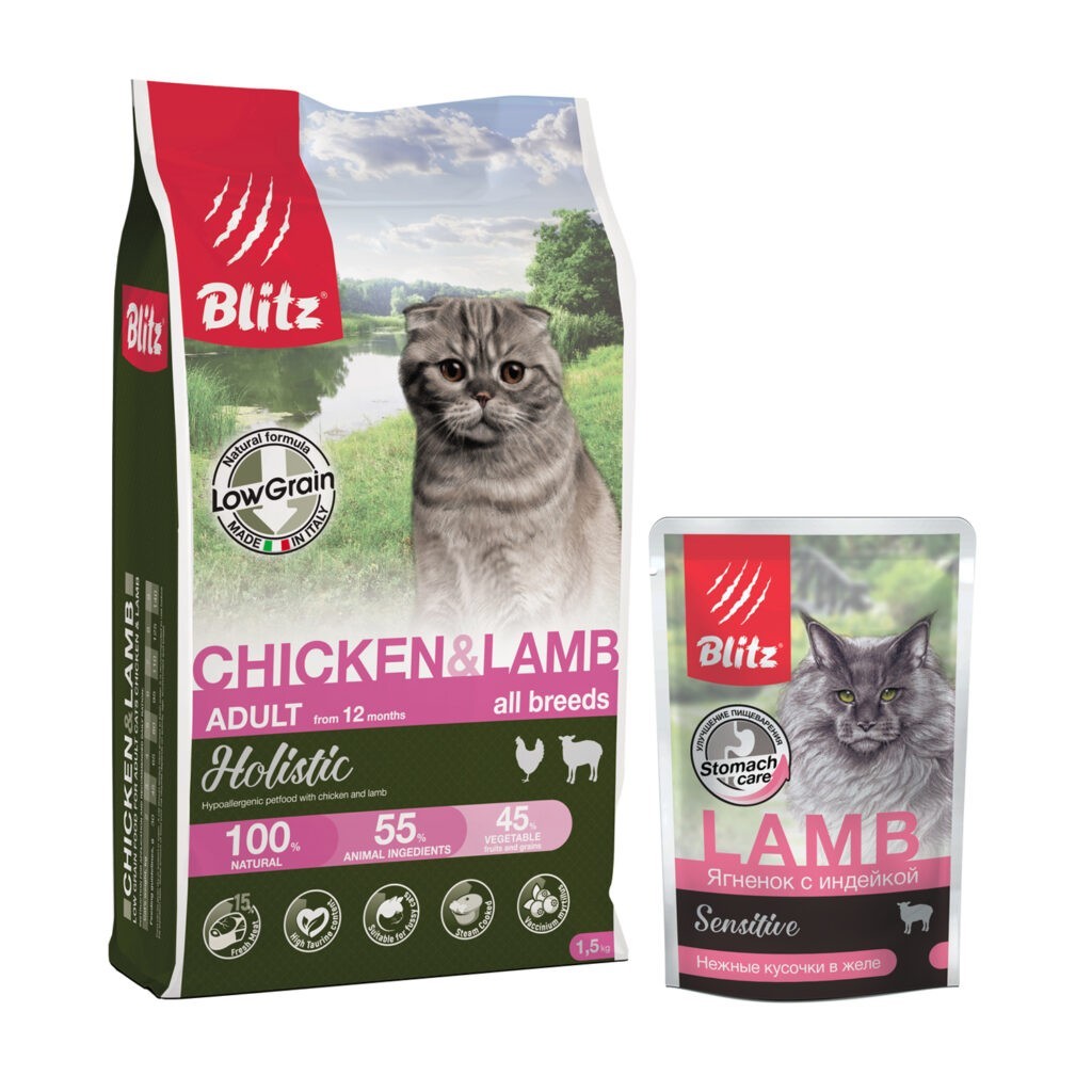 BLITZ КУРИЦА И ЯГНЕНОК для взрослых кошек всех пород При выборе качественного корма для питомца с чувствительным пищеварением всегда стоит