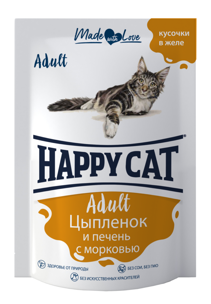 Паучи Хэппи Кэт /цыпленок – печень – морковь/ в желе (Россия) – 0,1 кг